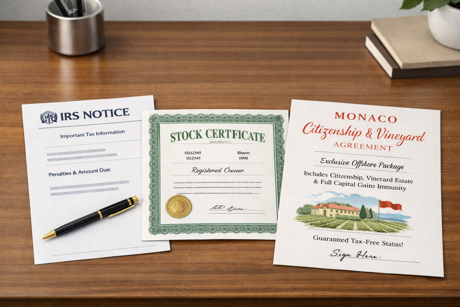 The broad answer is that this sounds far less like tax planning and far more like fraud with a European accent. The Monaco angle is classy. The vineyard adds flair. “Full immunity from capital gains” is where the whole thing really earns its clown nose. A legitimate strategy usually comes with documentation, regulation, advisors you can verify, and a structure that still makes sense after a good night’s sleep.
