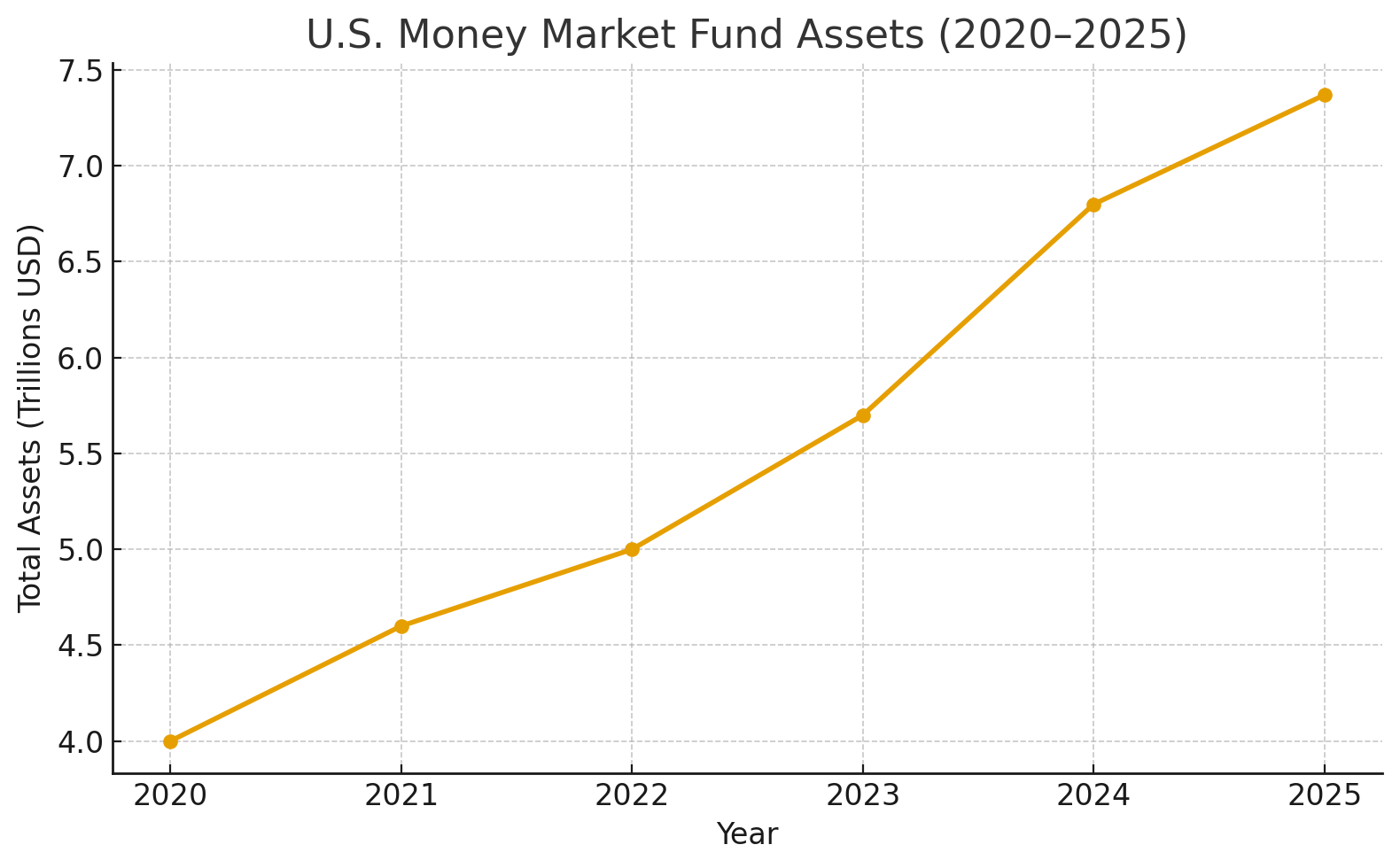 Over recent years, money market assets have risen dramatically. Total U.S. money-market fund assets increased from approximately $6.85 trillion at end-2024 to about $7.37 trillion by mid-October 2025. A key moment: on March 5, 2025, ICI reported assets reached $7.03 trillion — a previous record.