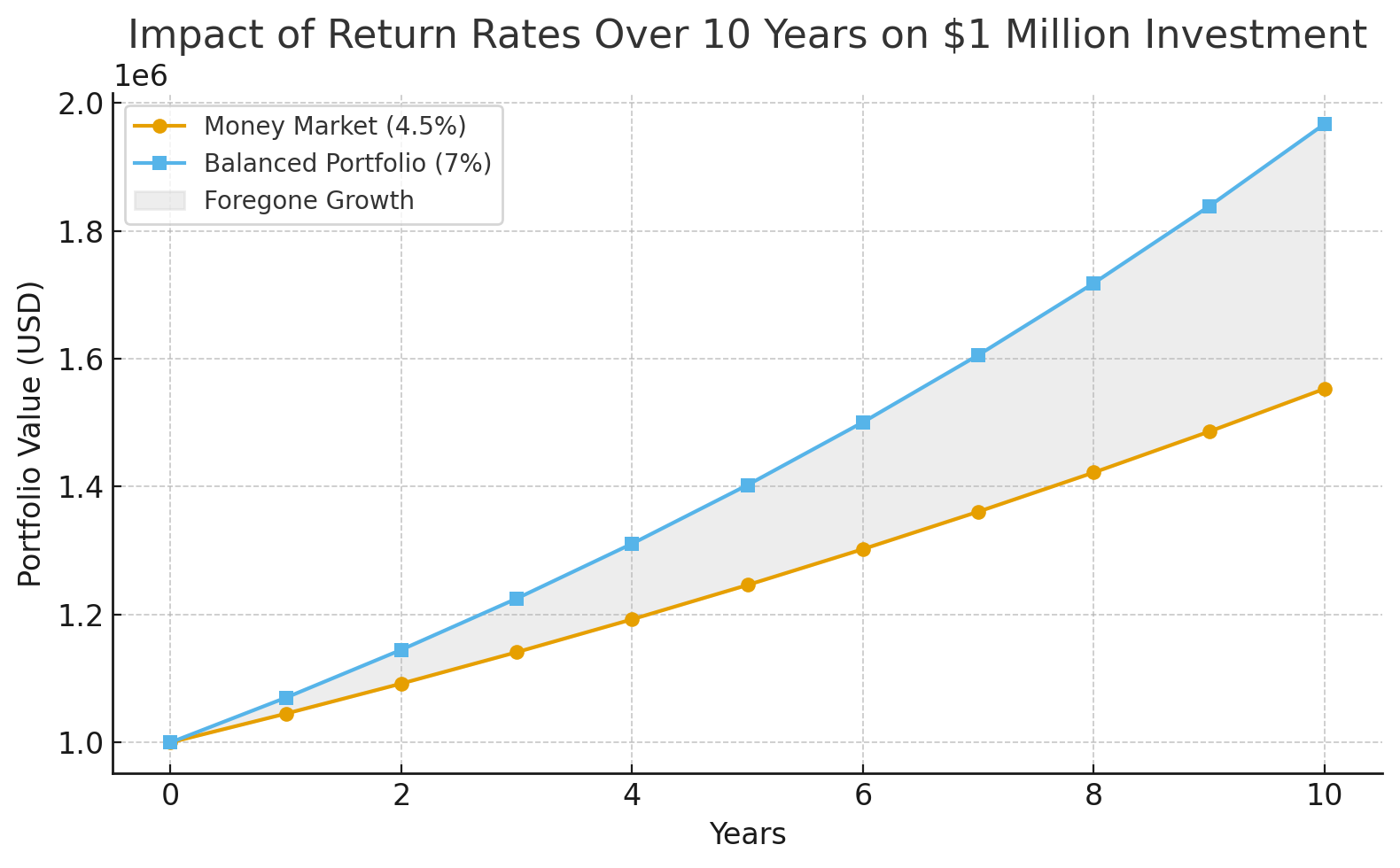 Suppose you held $1 million entirely in money market funds yielding roughly 4.5 % annually. After 10 years (ignoring taxes and assuming stable yield), you’d have about $1.55 million. That sounds good until you compare it with a balanced portfolio earning, say, 7 % annually, which would grow to near $1.97 million. That’s ~$420,000 in foregone growth.