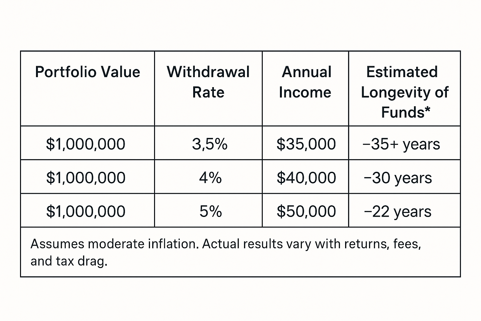 The table illustrates the essential trade-off: higher withdrawals provide more income now but reduce long-term durability. The “right” rate is therefore not fixed but tailored — reflecting health, tax situation, and willingness to adjust spending when conditions change.